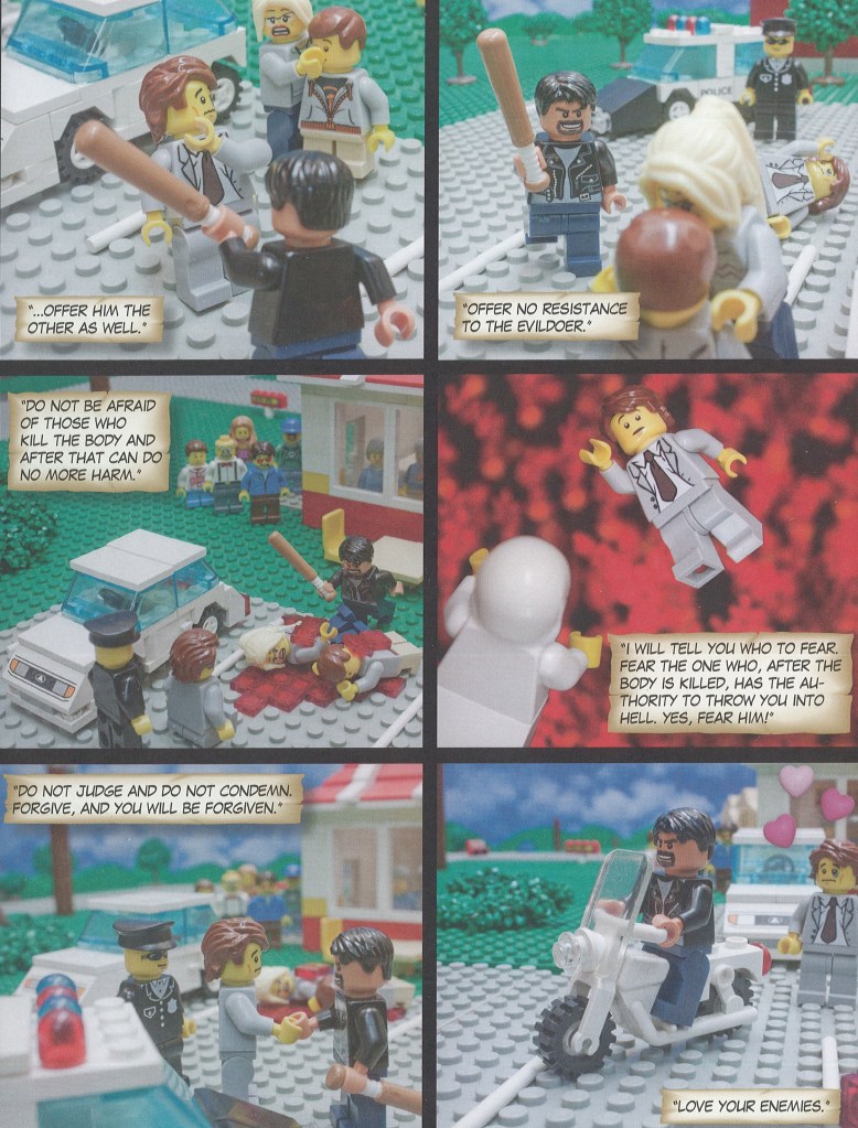 The teaching, ‘Do not resist an evildoer … Love your enemies and pray for those who persecute you,’ can be misinterpreted, and I want to show you one of the funniest misinterpretations I have come across. This is from The Brick Testament by Brendan Powell Smith[1] and shows the Sermon on the Mount in Lego bricks. A Lego criminal, in a black jacket, presumably leather, and with a frowning bearded face, attacks a mild-mannered Lego minifig in a grey suit. He not only hits the suited minifig, he kills the suited minifig’s minifig wife and minifig son. The mild-mannered minifig forgives the criminal, invites him home for cake, helps him steal his possessions, and gives him the key to his red Lego sports car. That does illustrate what Jesus is saying, but it is certainly not what Jesus meant. Some misinterpretations are less amusing. For a couple of days this week, I attended a conference on Gendered Violence held by The Wesley Centre, so I want to make it clear that these antitheses do not mean that the Christian response to family violence is to forgive the attacker, endure the suffering, and pray harder.